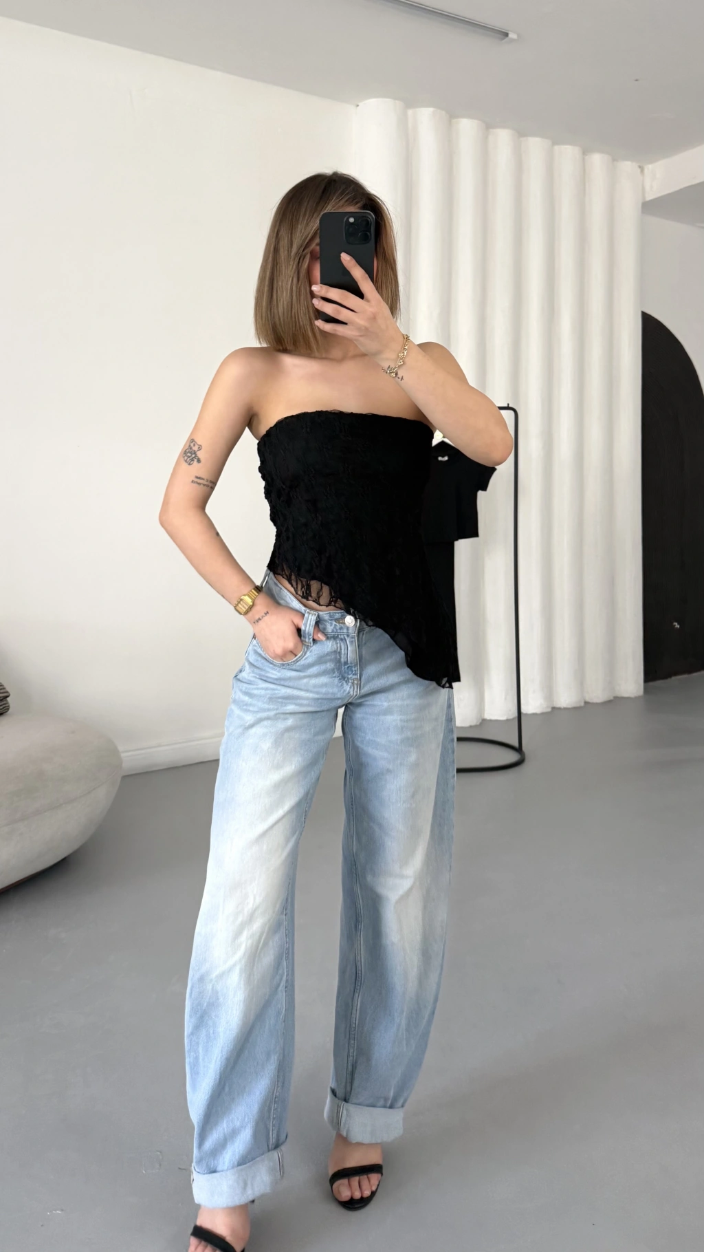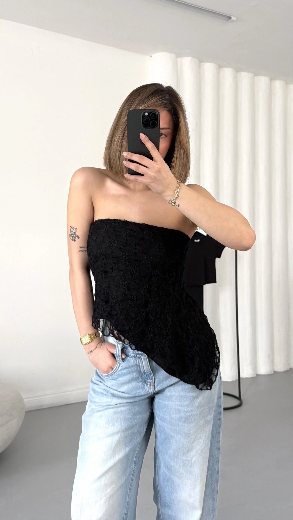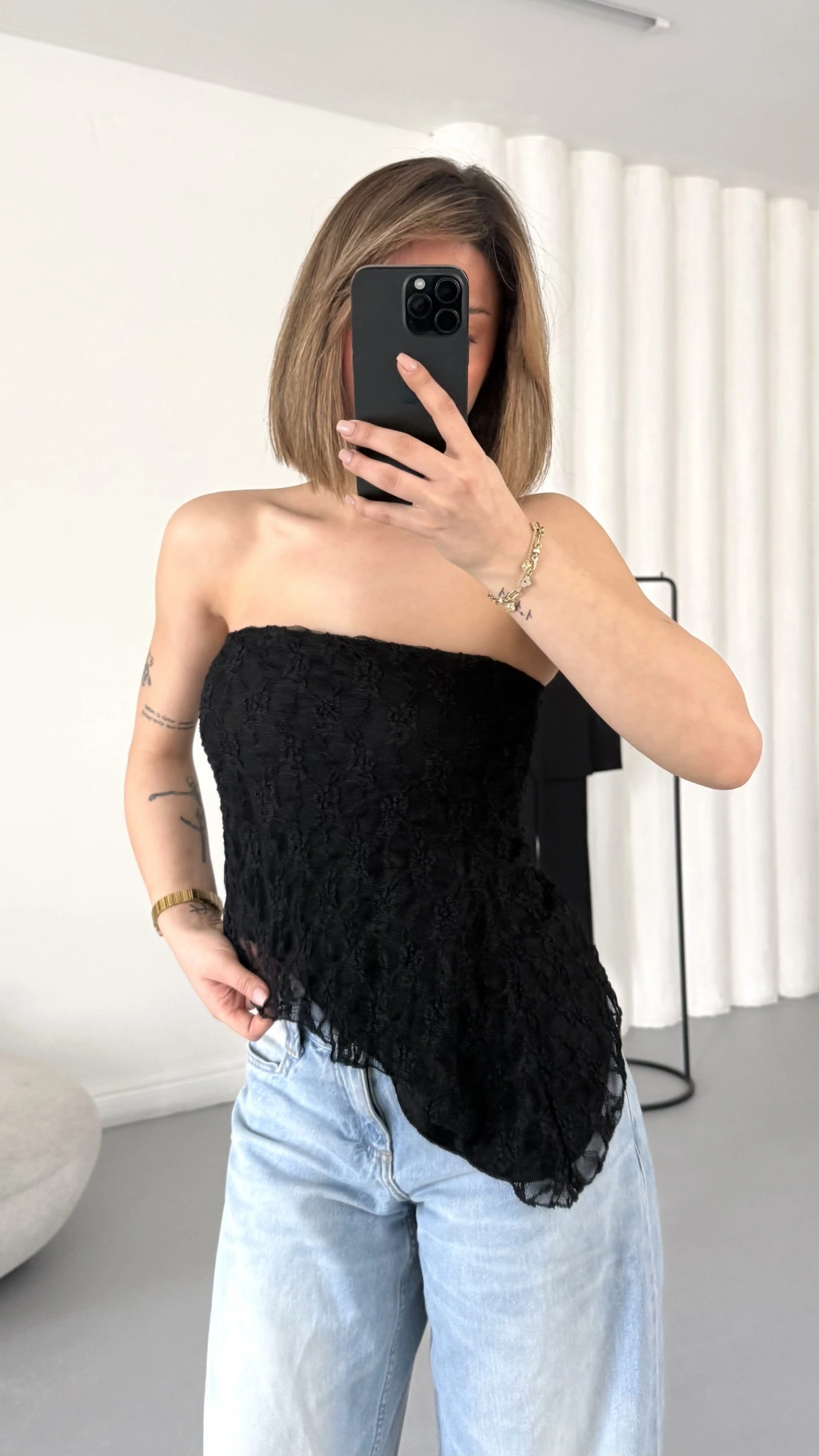 Alain Straplez Dantel Crop - Siyah