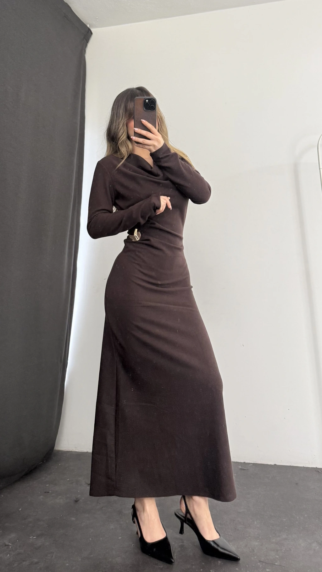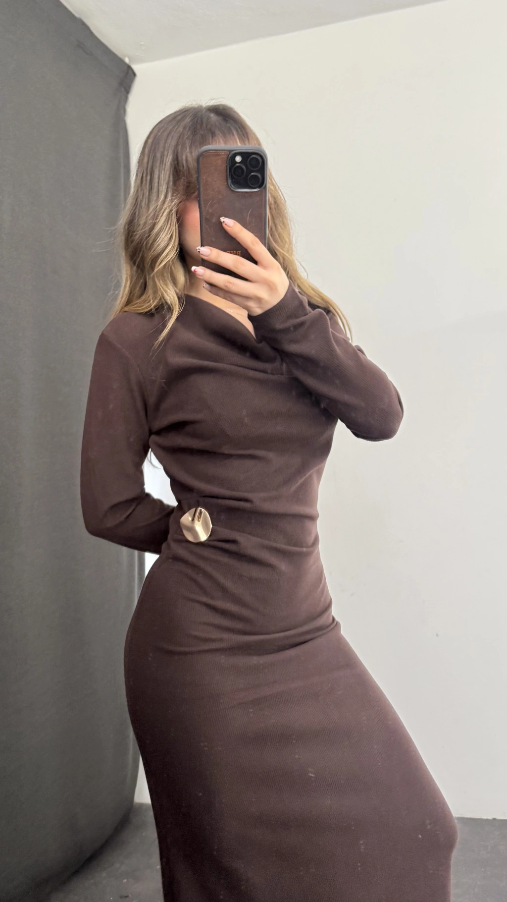 Aven Degaje Yaka Tokalı Elbise - Kahve