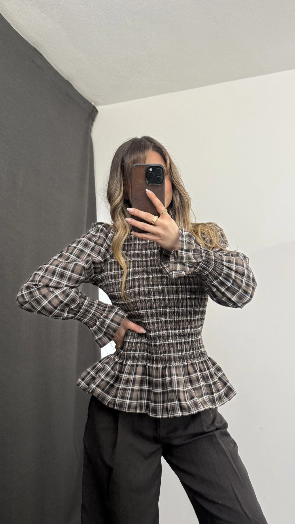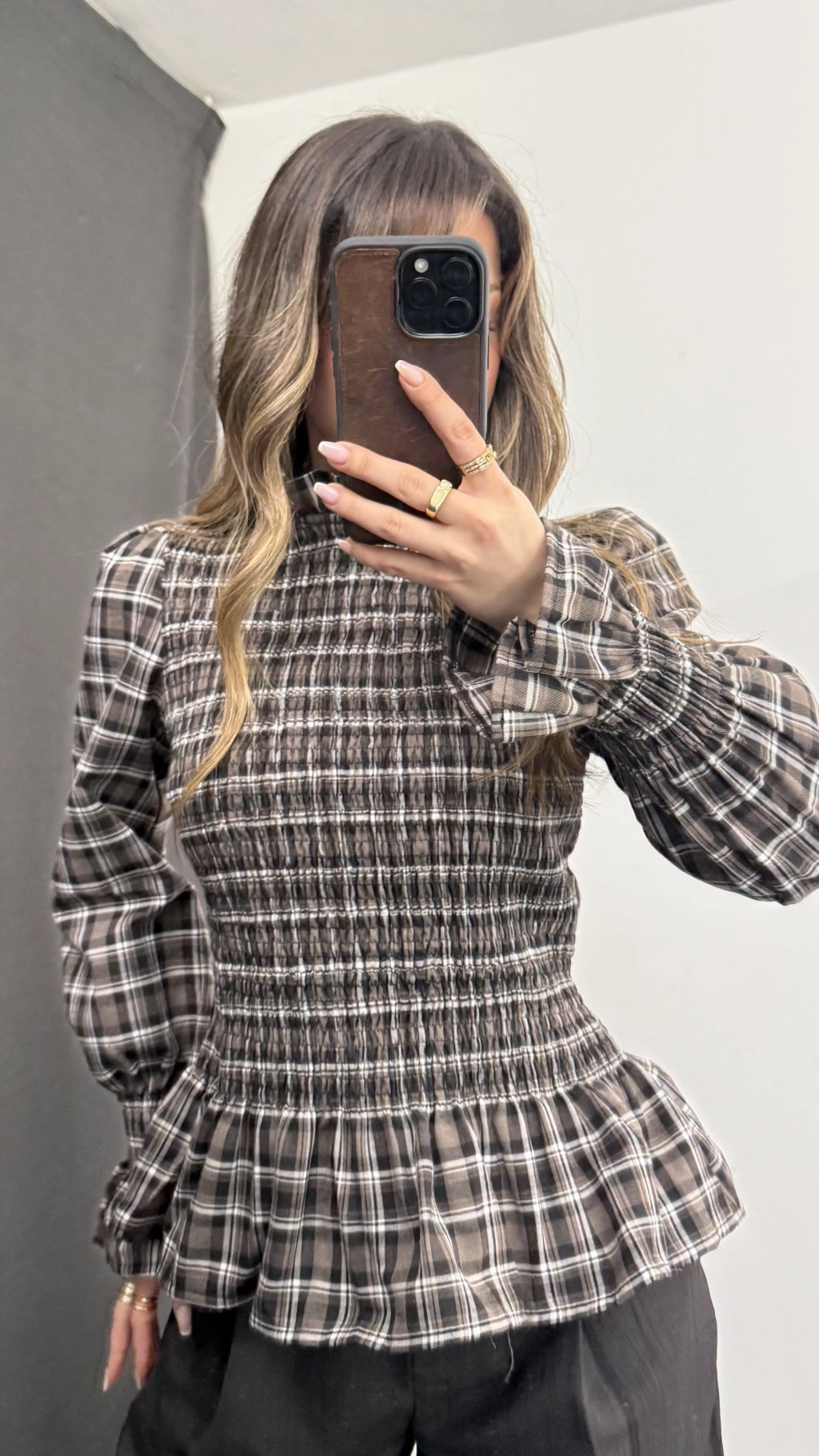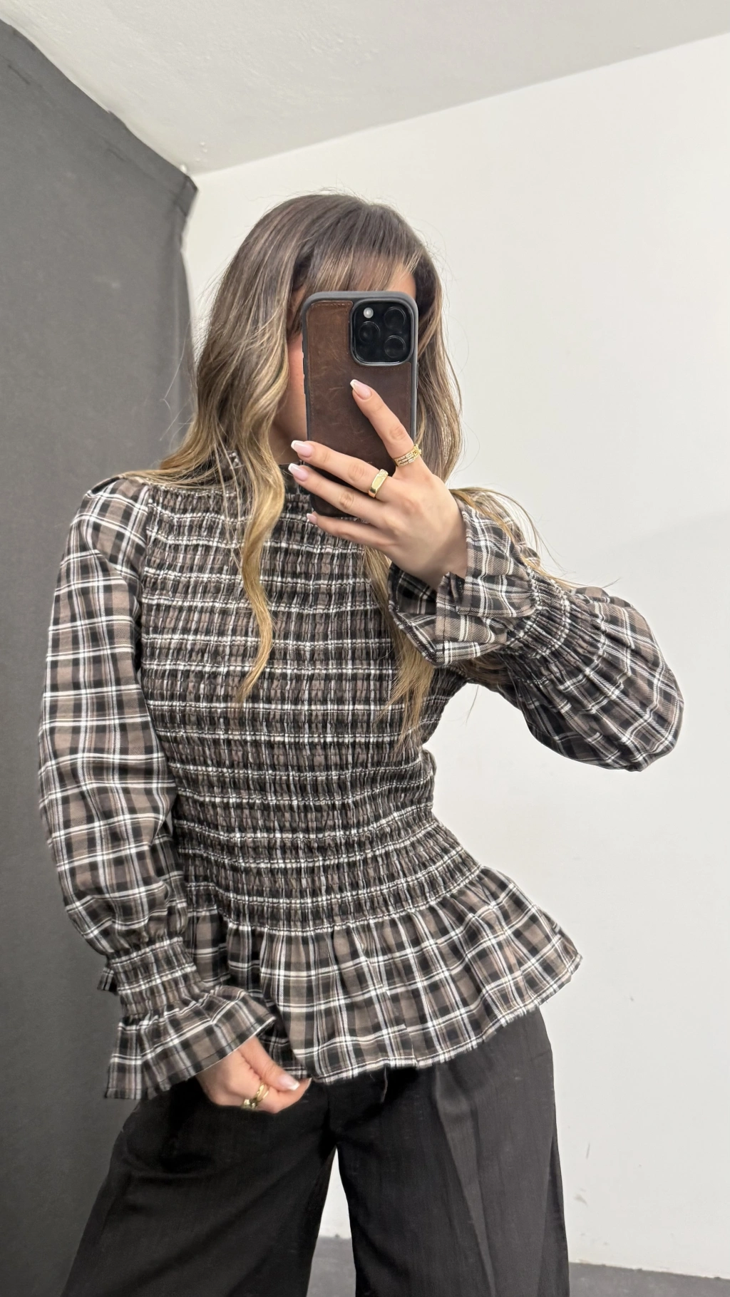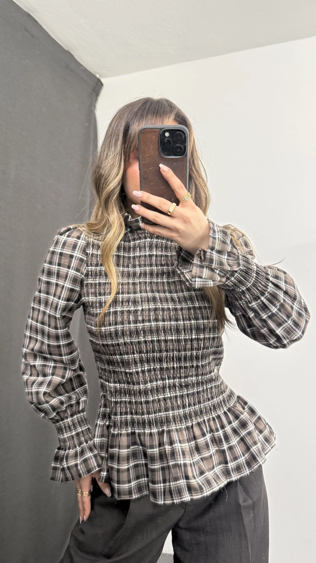 Jania Büzgülü Ekoseli Bluz - Bej