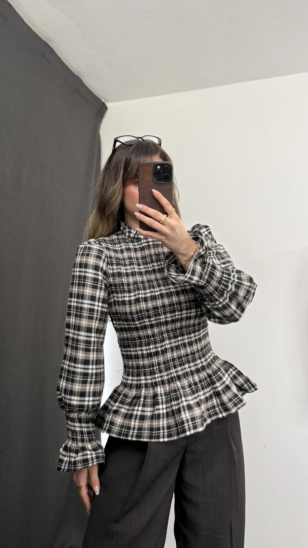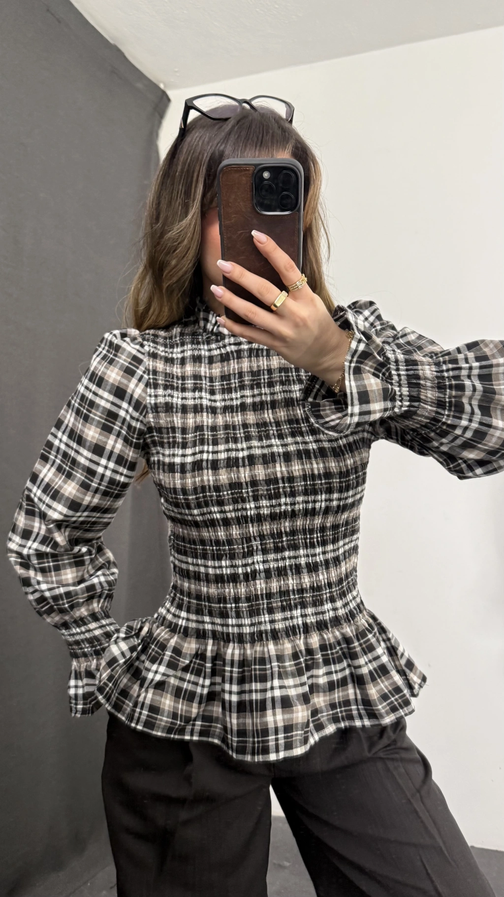 Jania Büzgülü Ekoseli Bluz - Kahve
