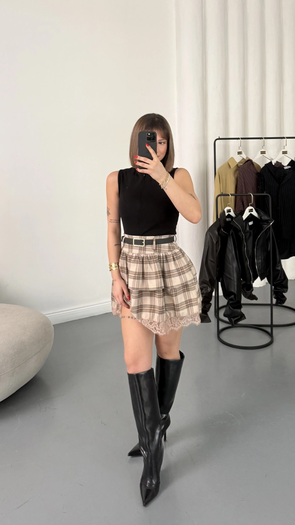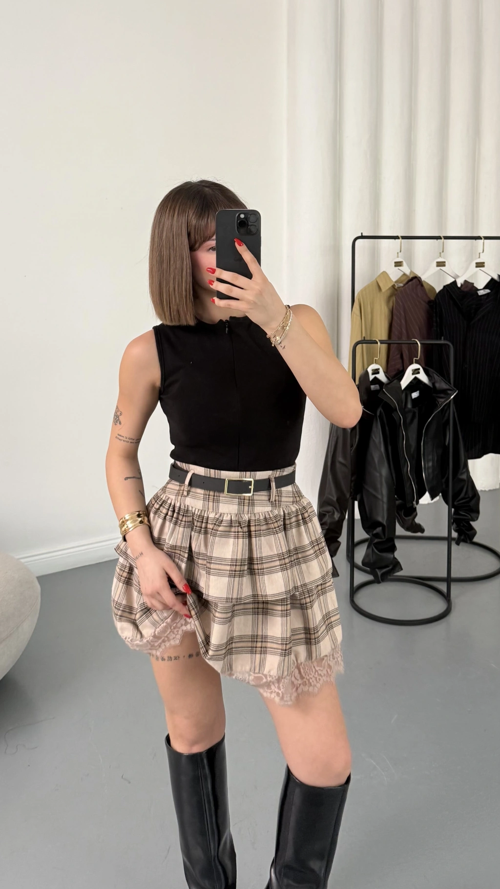 Katlı Ekose Etek - Bej