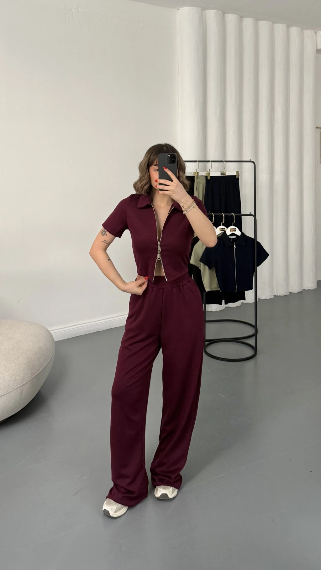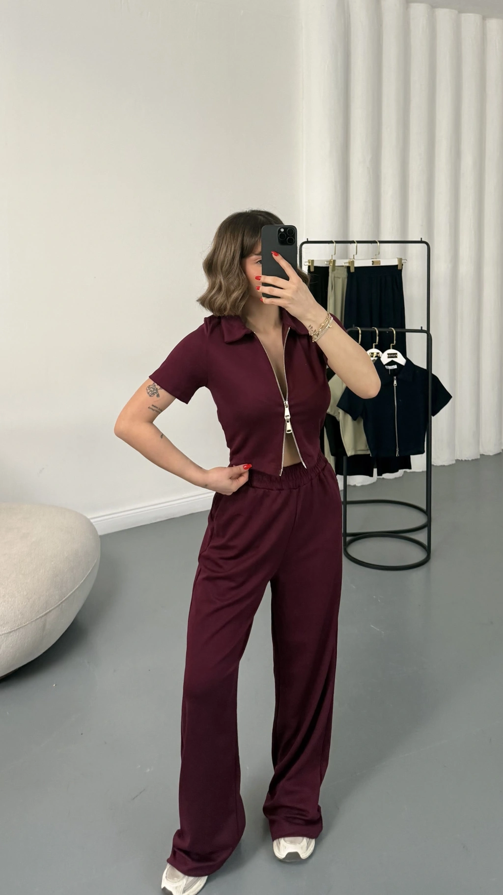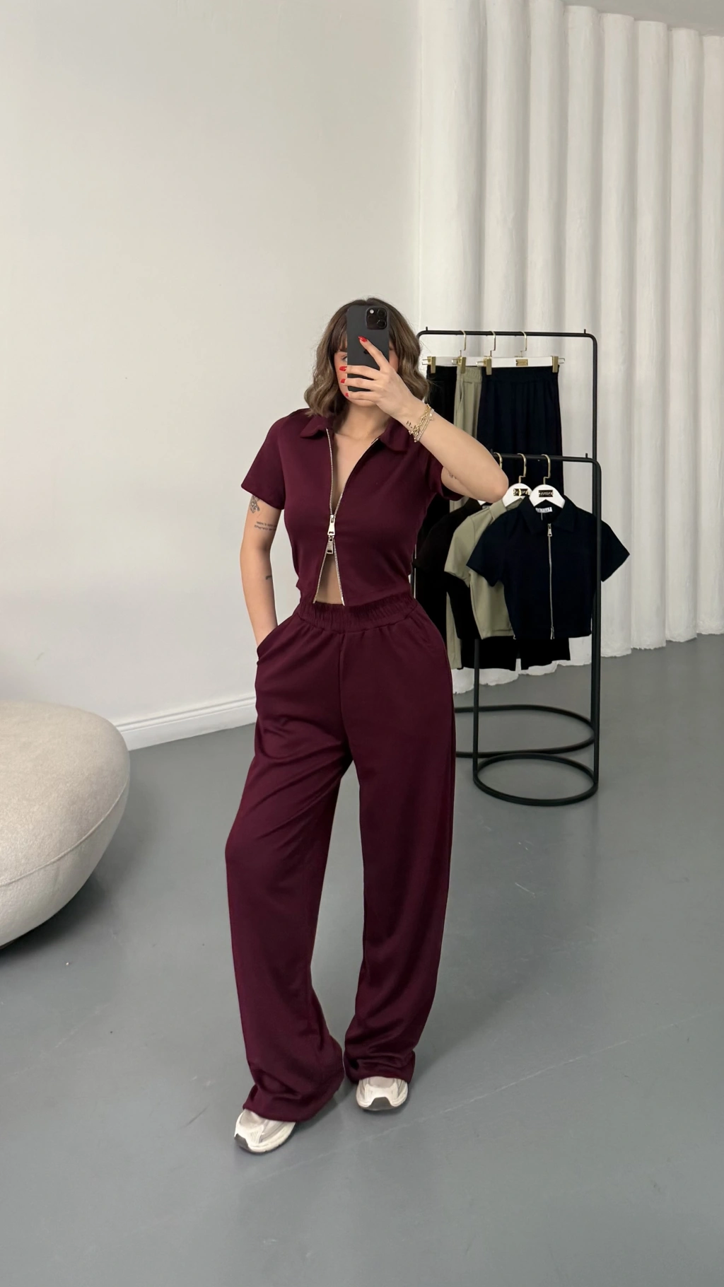Rena Fermuarlı Crop Takım - Bordo