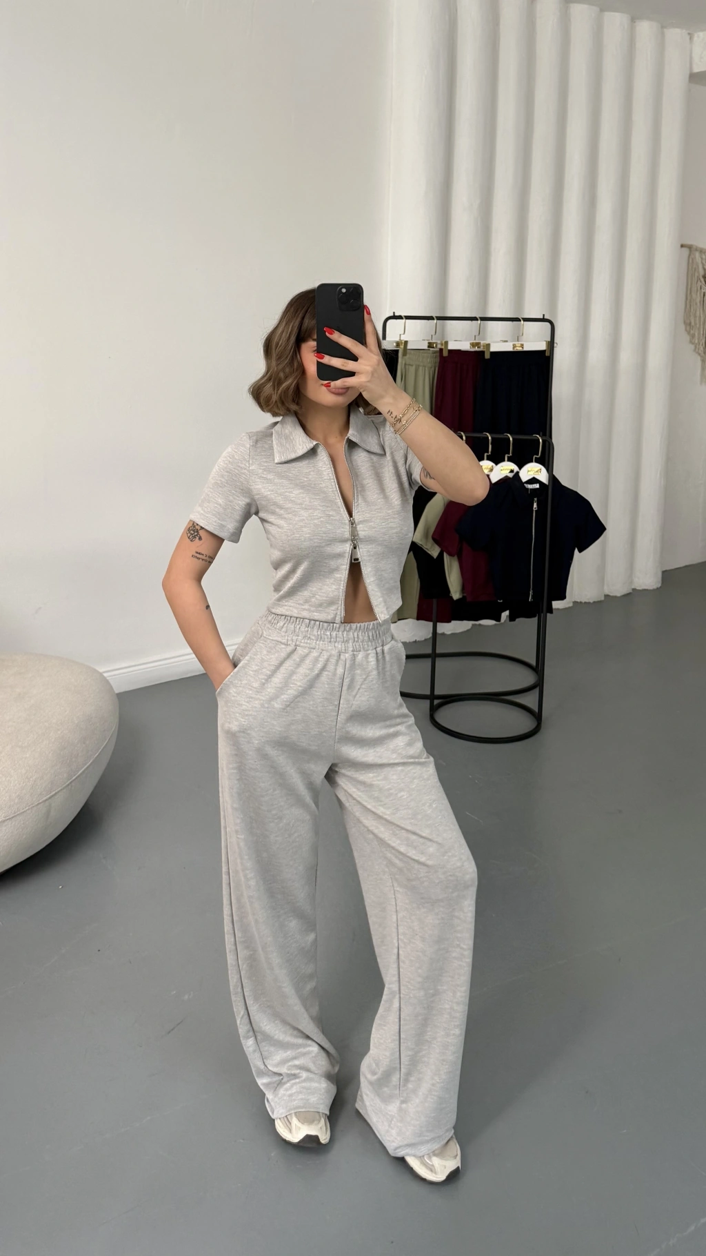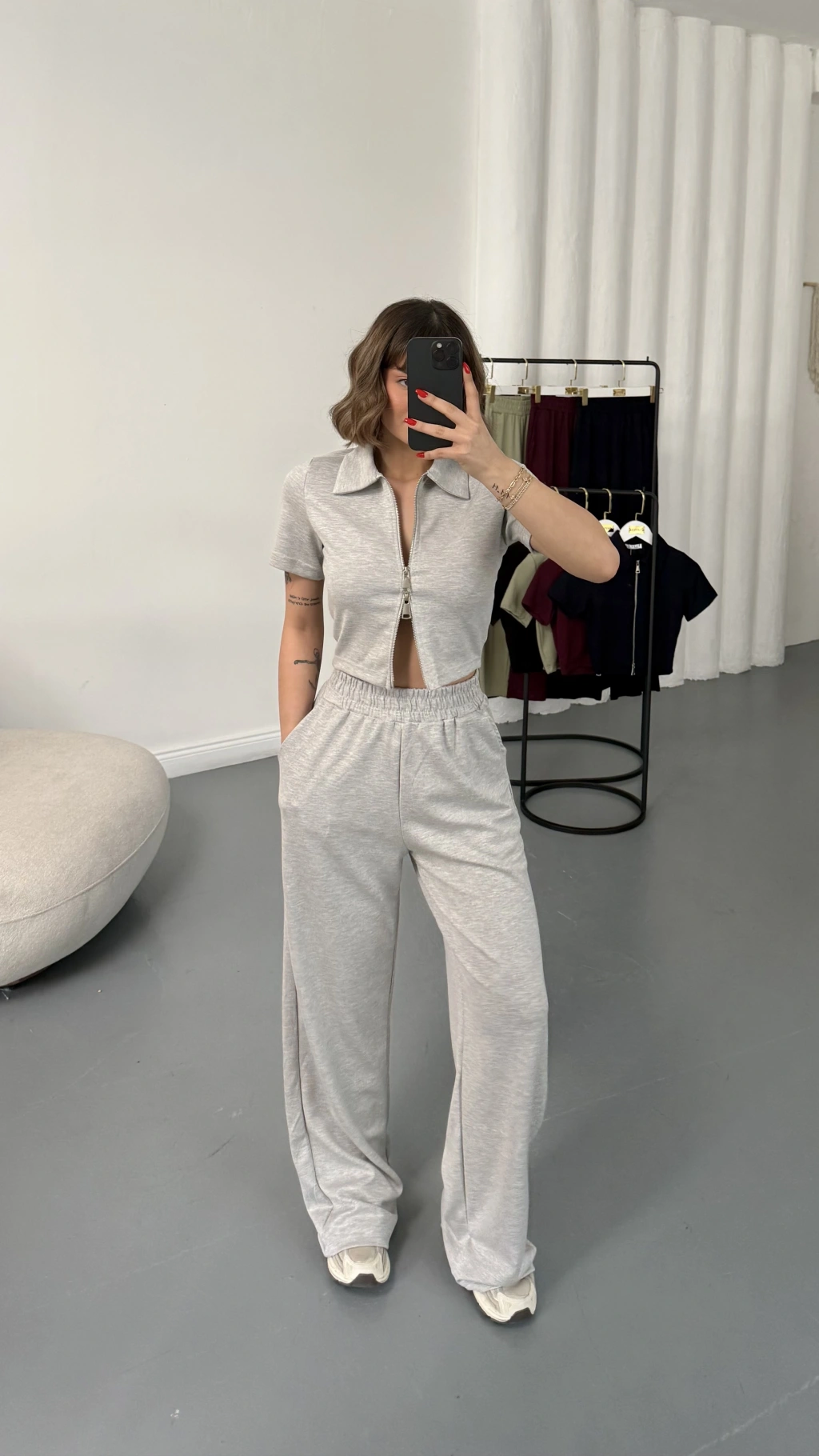 Rena Fermuarlı Crop Takım - Gri Melanj