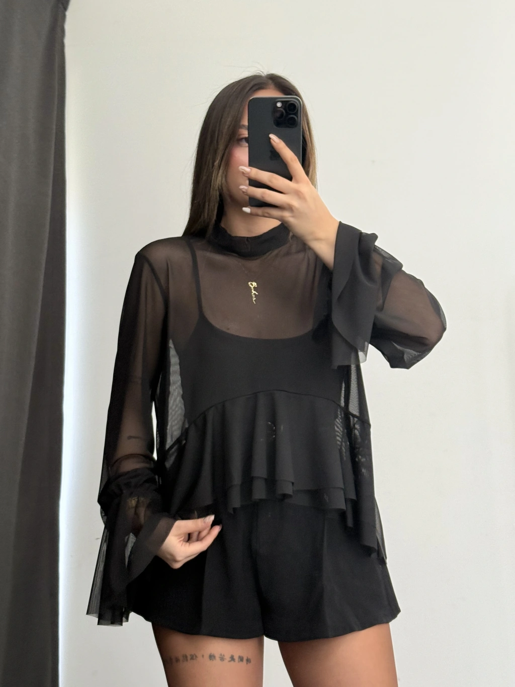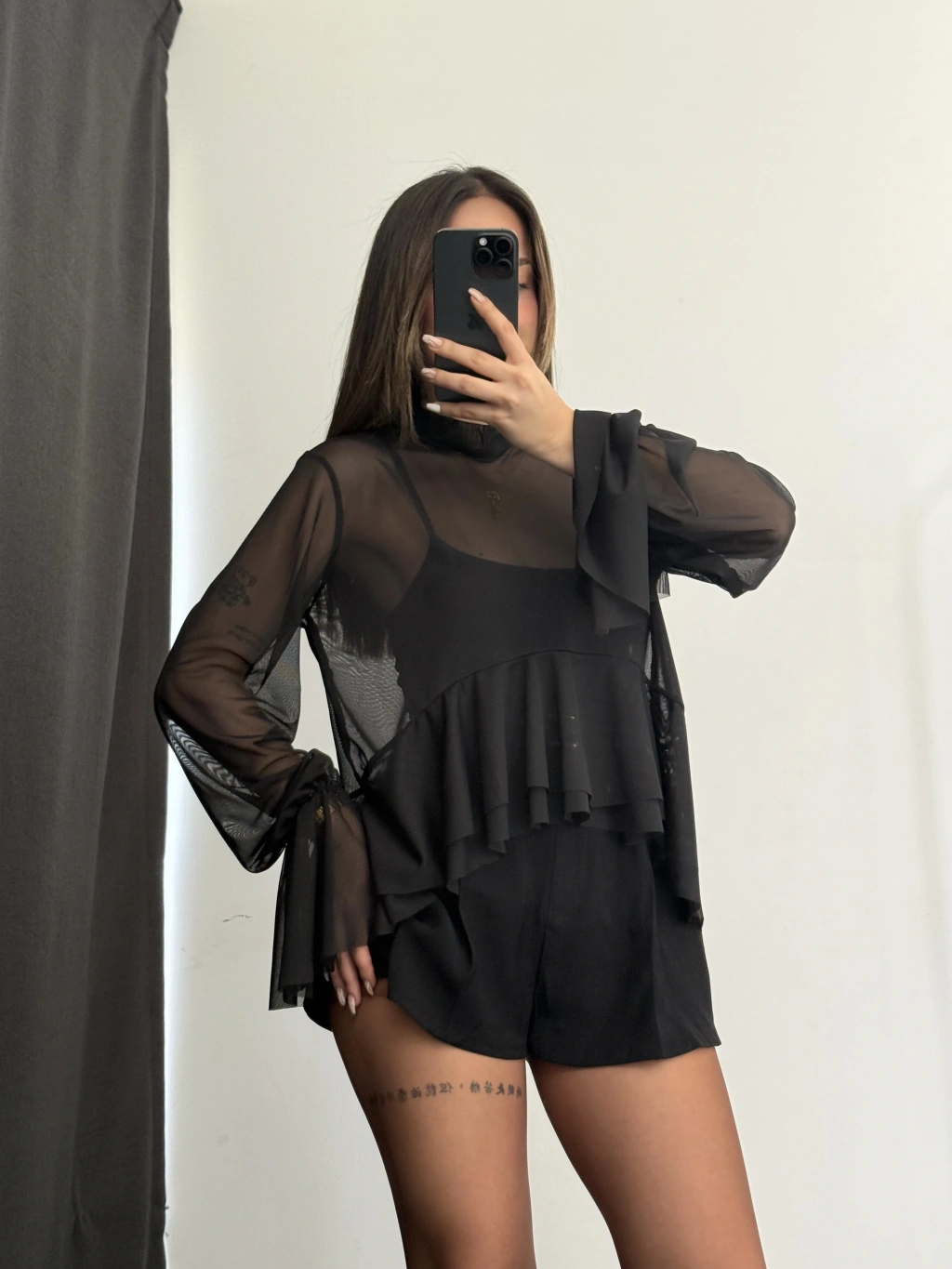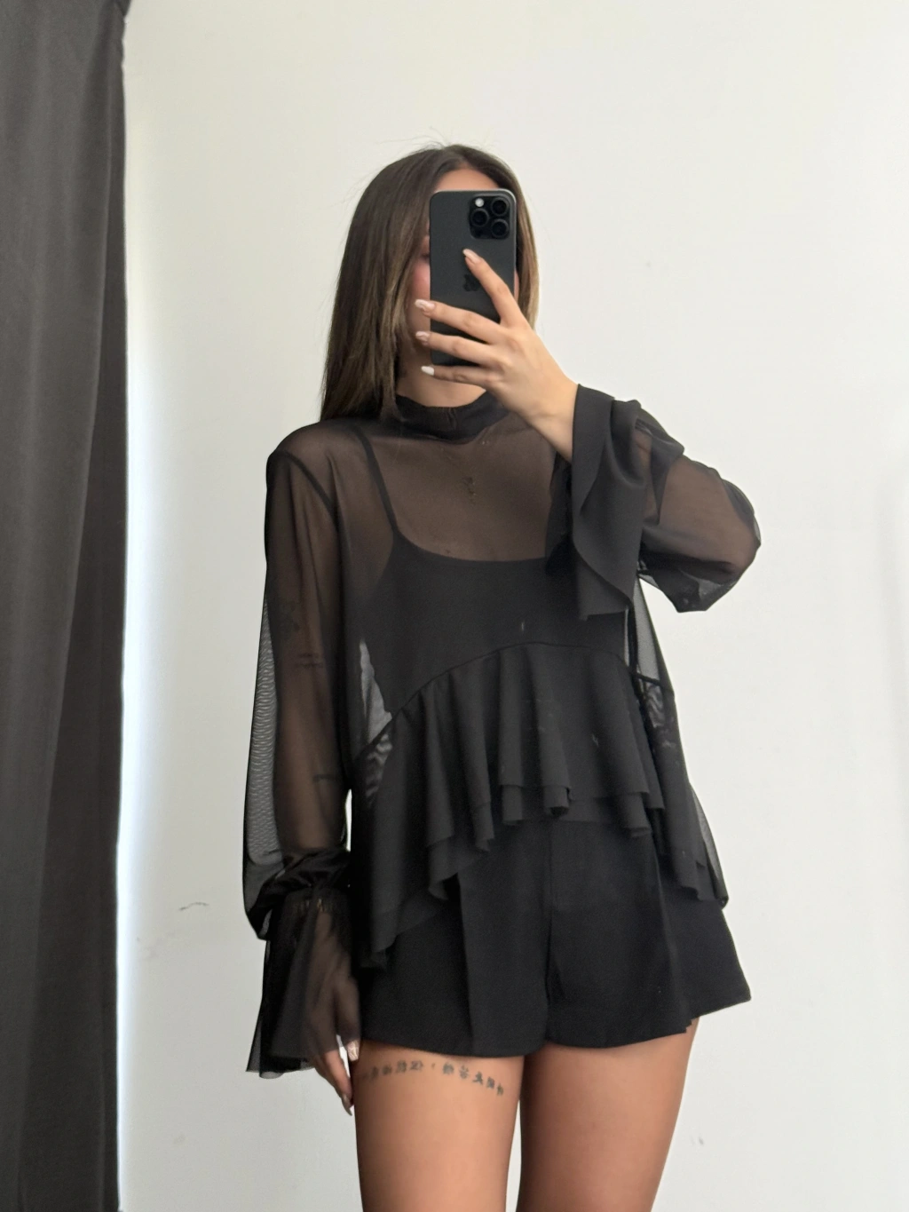 Volanlı Tül Bluz - Siyah